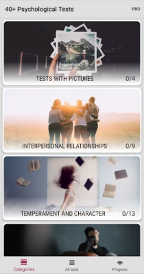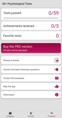 - Intelligence tests: IQ - Tests with pictures - Detailed analysis of your answers in each test. - Complete tasks and receive gifts. - Modern material design. - Share your results with family and friends. - Take a test for depression, personality type, self-confidence, the ability to understand people. Get to know your strengths and weaknesses better. Understand the causes of conflicts in your family and more.