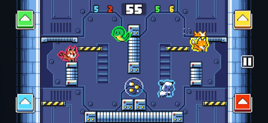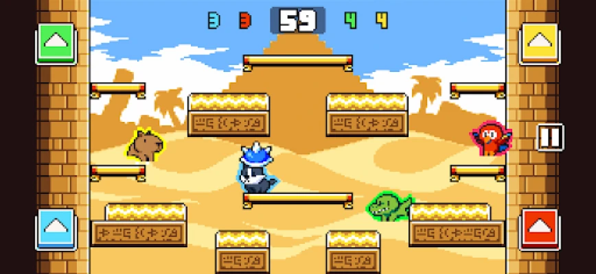 Features: - Simple one button controls: Press to jump, double tap to quick turn. - 2 game modes: Timed, where winner is animal with most points, and Lives, where winner is last animal standing. - Team Battle mode for 2 vs 2 and 1 vs 3 battles. - 8 battle arenas with their own layouts and stage gimmicks. - Over 100 cute and colorful animals to unlock!