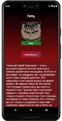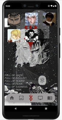 Возможности приложения: - Возможность установить обои высокого качества на ваше устройство, скачать, а также поделиться с вашими друзьями. - Репозиторий персонажей по вселенной берсерк. - Просмотр аниме онлайн. - Чтение манги онлайн.(планируется)