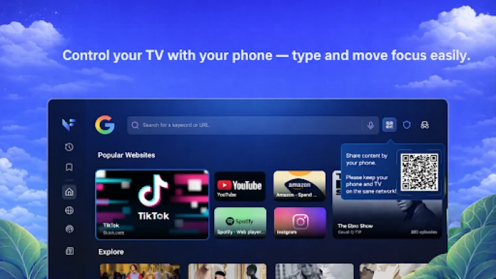 With ViewFlow, you can easily enter text, search, and navigate pages using your mobile phone or voice, making browsing on TV more natural and convenient. The interface is optimized for large screens and lean-back viewing.