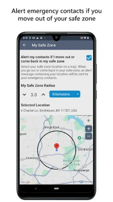• Alert my emergency contacts if I move out of my safe zone: Let your loved ones know about your safety status. Circle your safe zone location on a map. When you go beyond your safe zone or come back in, an alert message containing your location will be sent to your emergency contacts.