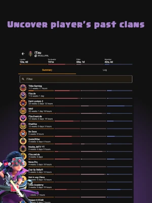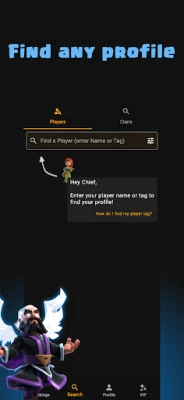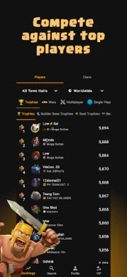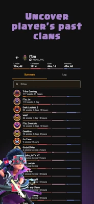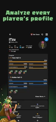 - See Player's clans history - Compete against other Players and Clans in Rankings - Search for Players by name and Town Hall level - See Clan's past members - View Clan War League results - Track Players and Clans progress - See all Clan's members at a glance - Open a Player or Clan profile directly in game