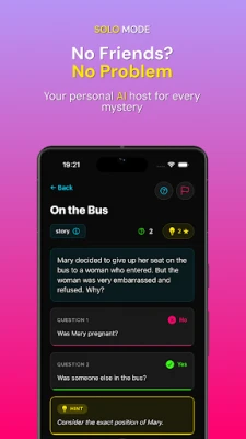 Your personal AI assistant helps you solve mysteries! Simply ask questions using your voice (or type them) and receive instant "yes" or "no". The AI guides you through the investigation, making you feel like a real detective. Perfect for solo play anytime, anywhere!