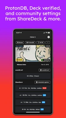 The Game Details view consolidates data from multiple sources, including ProtonDB, Deck Verified status and Steam reviews.