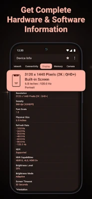 📟 Display: Display Details including Resolution, Density, Font Scale, Physical Size, Refresh Rates, HDR, HDR Capabilities, Brightness, Screen Timeout, Orientation.
