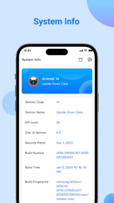 π System Info: Get information about OS Version, Code Name, API Level, Security Patch Level, Bootloader, Build Number, Baseband, Java VM, Kernel, Language.