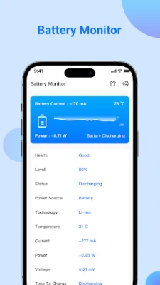 π Battery Info: Monitor your battery's health, level, status, technology, temperature, voltage, power (watts), current (mA), and capacity in real time.