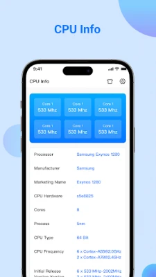 π CPU Info: Display all details about the System on Chip, Processors, CPU Architecture, Supported ABIs, CPU Hardware, CPU Governor, Number of Cores, CPU Frequency, GPU Renderer, GPU Vendor & GPU Version.
