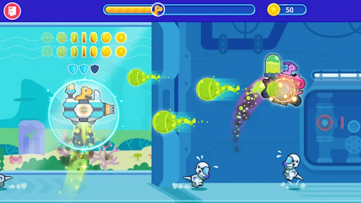 Dinosaur Dash invites players to navigate through four distinct themed environments: Laboratory, Space Base, Dinosaur Planet, and Ocean World. Spread across 20 well-designed levels, each filled with traps and obstacles, the game offers a challenging yet rewarding adventure run for kids. With the aid of shields and shockwaves, players can overcome these challenges and push forward towards their objectives.
