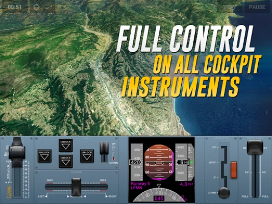 The simulator includes 36 missions to accomplish, 216 challenges to pass, cartography and worldwide navigation with over 500 accurate airports replicas as well as real time weather conditions.