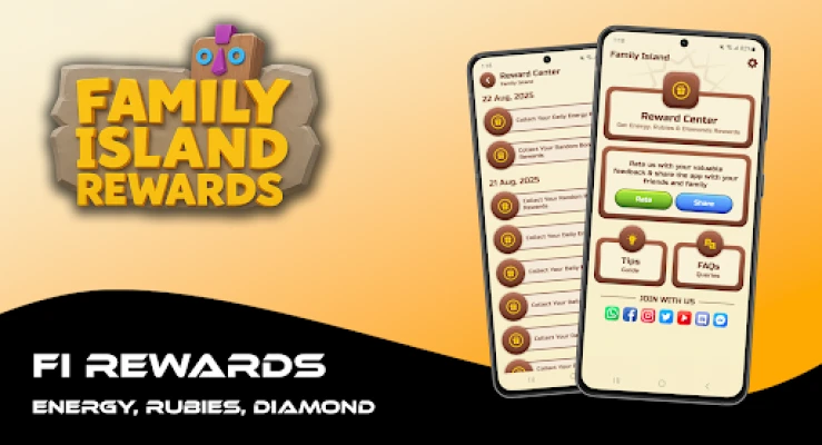 This is not official app and is not affiliated. Family Island Rewards is not a gambling app, we never offer real money or coins. We share only the rewards that helps you to play more. We collect energy, rubies and diamonds rewards from the public domains including Facebook, Twitter, and the Instagram page of Family Island. We don’t collect user personal details in our app and don't claim rights on any content in this application.