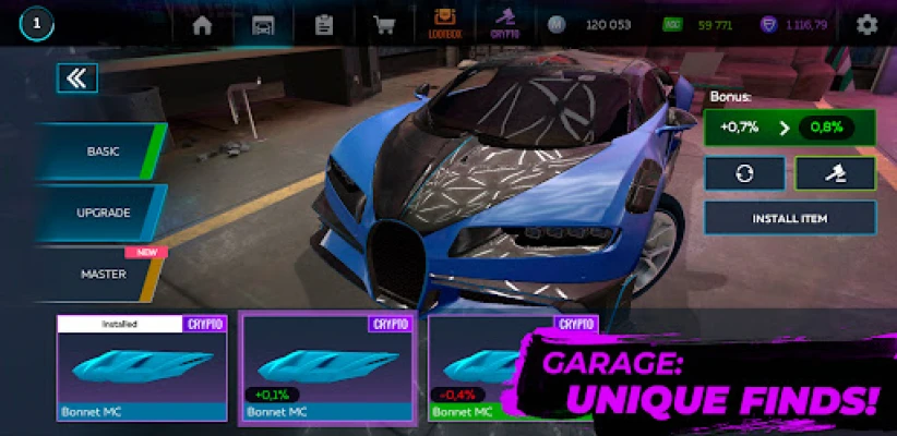 Level up your ride and earn bonuses by installing tuning kits where each component has a level assigned to it (Basic, Upgrade or Master). The higher the quality of your parts, the more bonus points you get.
