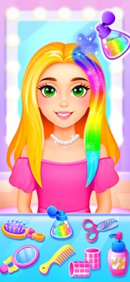 In this section of mobile haircut simulator for little kids you will find a wide selection of tools to create a unique hairstyle for your guest girl! Take a challenge and dye your hair an unusual color in hair style salon to make your character even more attractive. Straighteners, curling irons, corrugations – all this will help you experiment with hair and find your inimitable style in girls games for kids. You can also try using hair growth lotion and scissors to style both long and short hair in style games for toddlers.