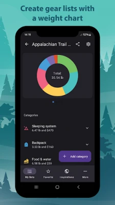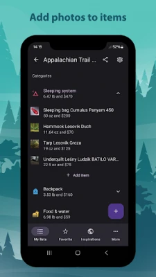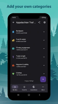 Track your backpack's weight when planning your hikes. Add items to selected categories and the app will count their total weight and present it on a chart. Get inspired by other HikePack users' lists and items. And if you want to add something from yourself, share your lists and items so that they become an inspiration for others. Happy Hiking!