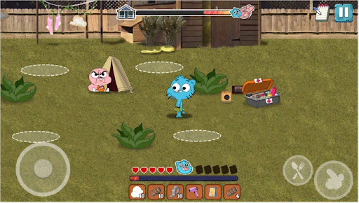The player controls Gumball attempting to survive while Nicole and Richard are out. At the bottom of the screen are Gumball's health (represented by hearts), hunger (represented by bags of chips) and his boredom meter. Gumball will lose health if he is attacked, and if he runs out he will die. Hunger drains over time and can be restored by eating food. Boredom also lowers over time and can be restored through various means of entertainment, such as breaking things. Gumball can use button to break objects and collect resources from them, such as bushes, totems, vases and other objects from around the house, and eat button to eat food from his inventory. Gumball only has 5 slots, which can carry up to 10 of a specific material each. If Gumball's inventory is full, he cannot pick anything else up. He can drop items by clicking on them.