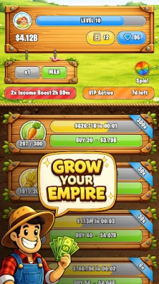 Start with a humble carrot patch and work your way up through 14 unique producers — from wheat fields and chicken coops to high-tech Agri Labs and Sky Farms. Watch your coins roll in, automate your harvests, and unlock powerful upgrades to boost your income.
