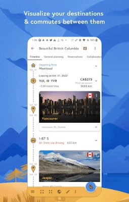 - Visualize your trip timeline and saved locations on interactive, intuitive maps.