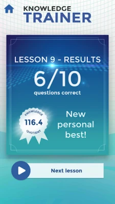 Each trivia lesson tests your wits with 10 questions from 10 different categories. The difficulty level depends on you: get an answer right, you'll move up a level. A wrong answer leads to an easier question. But you'll want to move up to improve your Knowledge Quotient, recalculated after every round.