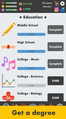The game contains subtle lessons about financial investment, relationship, career, time management, and life philosophies. Life is a balancing act between health, happiness, mental sanity, and wealth constrained by our limited lifespan, you get to decide how you want to live your life. There are many ways to win!