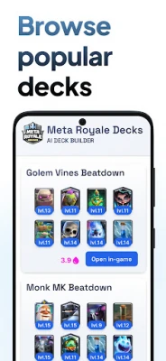 Tired of searching for effective decks? Our app helps you discover powerful strategies by providing AI-generated decks tailored to your specific needs and card levels.