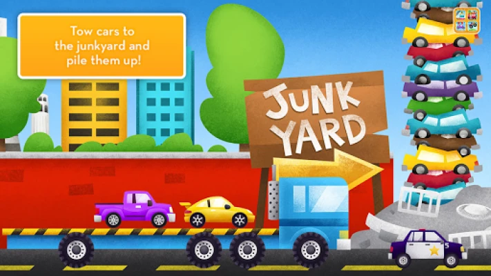 Drive a fire truck, race monster trucks, build structures with a crane, drive a flatbed tow truck, and stack cars in junkyard!