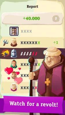 The humble subjects perform your every command! Just don’t forget to at least occasionally consult with the Inquisition, or else those ungodly learned ones will walk all over you! Is it still not time to start a new crusade? The army is awaiting orders to march. Do not praise the nobility too much, and for that matter, nobody. And by the way...you are the sovereign, it’s your decision how to rule!