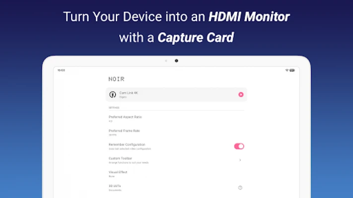 Noir supports UVC video streaming and UAC audio streaming, offering a choice between OpenGL ES and Vulkan for the graphics backend.