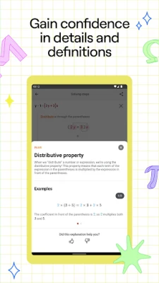 Self-paced learning: Photomath’s instant support is like having a 24/7 virtual tutor. Checking your homework before dinner? Stuck on a problem at 2am? We can help. Follow our detailed steps, taking whatever time you need to review definitions, rationale, and more – all within the explanation.
