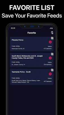 Feature Police Scanner: - You can find stations located in which state. - Reach live radios. You can also see listener counts for each station. - Show feeds near your location - Favorites list