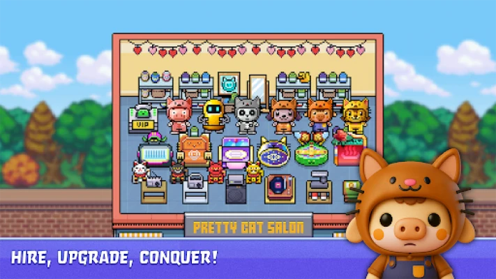 - Hire and level up your team of cute, helpful staff (including a robot cashier!).