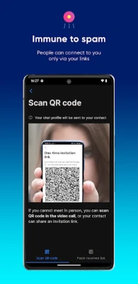 You can connect to anybody you know via link or scan QR code (in the video call or in person) and start sending messages instantly - no emails, phone numbers or passwords needed.