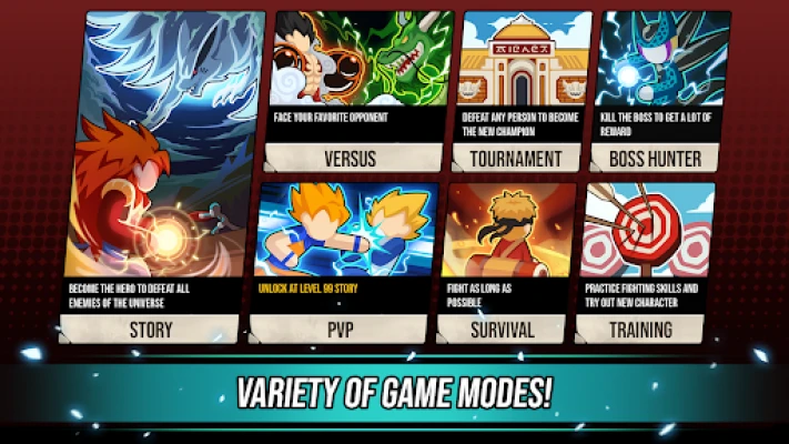 🚩 Versus mode: In addition to the traditional fighting mode, Super Stickman Dragon Warriors also introduces new team fighting modes for you to enjoy with your friends. Matches can also be included in the tournament to find the strongest team and win the biggest rewards.