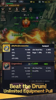 .Tap the war drum to earn gear—higher-level drums bring better loot
