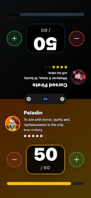 Track health for 1v1, 2v2, 3v3, and any team combination. The split-screen interface is designed for tabletop play—just place your device between players. Large tactile buttons make adjusting health easy mid-game, with haptic feedback so you feel every hit. Visual warnings flash when health gets low, and dramatic animations play when players are eliminated.