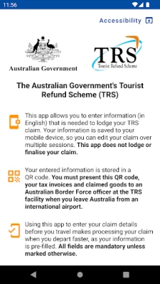 The app will allow you to enter the information that is required to lodge a TRS claim. The app will save the information to your mobile device, allowing you to edit the claim over multiple sessions. When you have finished entering your information it will be stored in a QR code on your device. This QR code is your TRS claim code. You must present your TRS claim code to an officer at the TRS counter on your departure from Australia.