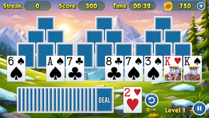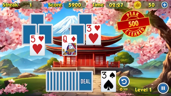 Your goal is simple yet challenging: remove all the cards from the three peaks. Simply tap on cards that are one rank higher or lower than the foundation card to remove them. If you get stuck, just draw a new card from the deck to continue. The more cards you place on the foundation and the more peaks you clear, the more points you earn!