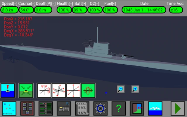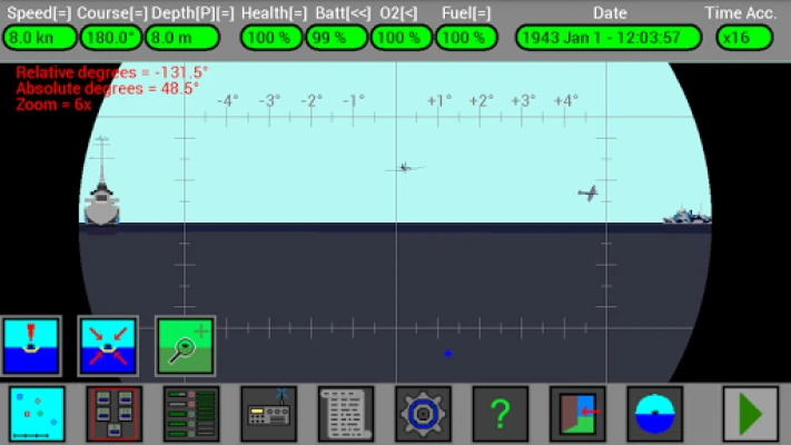 On the bottom of the screen there are buttons to go on the map, to go to the screen of the charging torpedoes, to bring up the window for launching torpedoes and guidelines, the button to exit the game and on the right the button to put in pause the game.