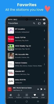 Easily sort stations by popularity — each one displays its number of favorites. Use the Most Popular filter to explore what's trending today, this week, this month, or all-time. Want a local flavor? You can also view the top stations by country or genre. Prefer a different view? Sort stations alphabetically or by most recent additions — the choice is yours!