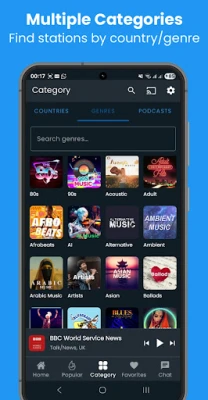 Discover radio stations by country or explore genres such as pop, rock, and oldies. You can even search within countries or genres.