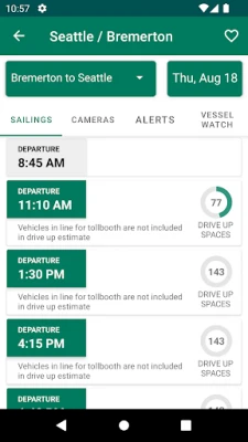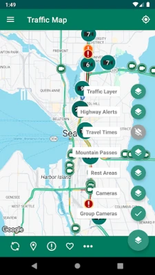 The WSDOT mobile app contains Seattle traffic and travel info for the state of Washington. Includes statewide traffic cameras, travel alerts, mountain pass reports, ferry schedules, bulletins, Vessel Watch, and northbound Canadian border wait times.