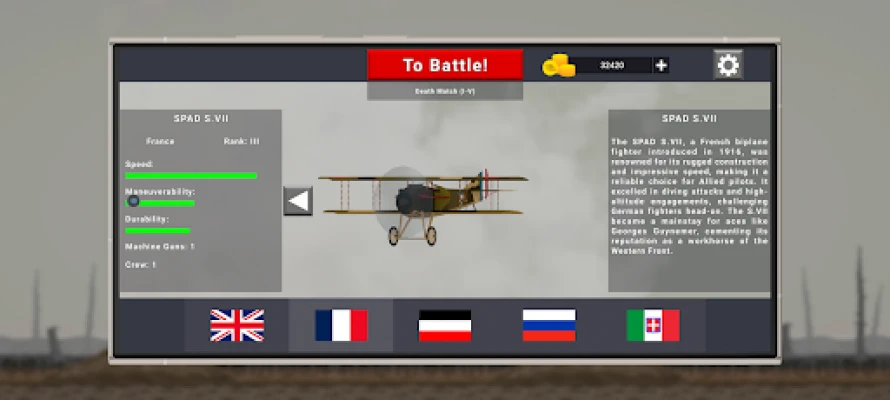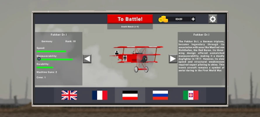 ✈️ 5 nations available: Great Britain, France, Germany, Russia and Italy. Choose your nation and fly for your country in the sky battle!