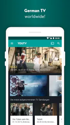 Finally watching German TV how I want - worldwide. With YouTV® you record every German TV channel, every TV show, worldwide with one click. The amazing YouTV is a cloud based Online TV recorder that enables you to record your favorite TV shows with one single click. No need for further hardware! Your App and the cloud VCR are enough! Lean back and select one of your recordings available from a simple to use App.